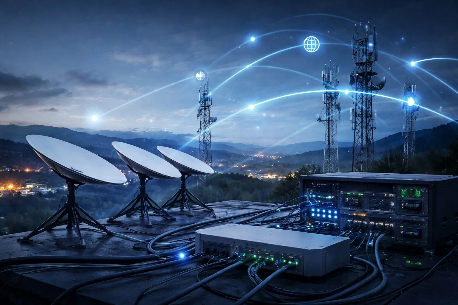 Hardware: Pole-mounted high-performance Starlink dishes + Directional Cellular Arrays.